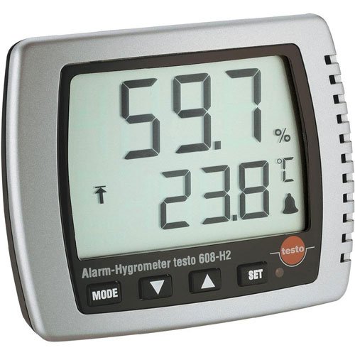 Testo 608-H2 alarm ThermoHygrometer, is an accurate humidity/dew point/temperature measuring instrument for the continuous measurment of of a given area over an extended period of time. With a large display it is easy to read, even at a distance and the suspension and stand fixtures allow for flexible placement on walls and tables. In addition The 608 H2 ThermoHygrometer has LED alarm function for accurate signals in the case of humidity and temperature limit violations. It displays min/max readings and comes with a 9V block battery and with the stable long-term sensor is can give accurate measurements for years.