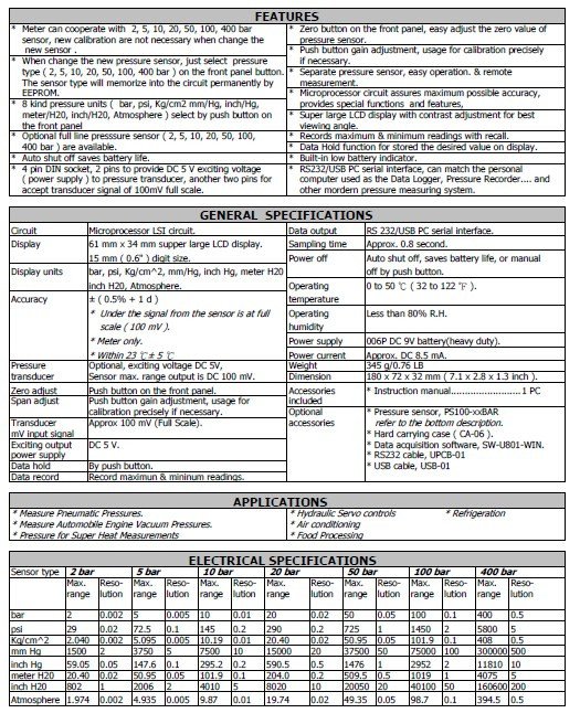 * Meter connects with 2, 5, 10, 20, 50, 100, 400 bar sensor, no calibration procedures are necessary when change a new sensor.