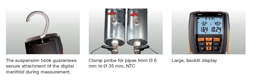 • The digital manifold testo 550, ideal for all measurement work on refirgeration systems and heat pumps