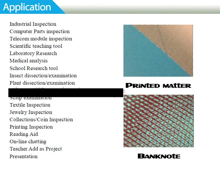 You can use this microscope for: Industrial Inspection, Computer Parts inspection, Telecom module inspection, scientific teaching tool, Laboratory Research, Medical analysis, School Research tool, Insect dissection examination, Plant dissection examination, Skin examination, Scalp examination, Textile Inspection, Jewelry Inspection, Collections/Coin Inspection, Printing Inspection, Reading Aid,Teacher Add as Project, Presentation and so on.