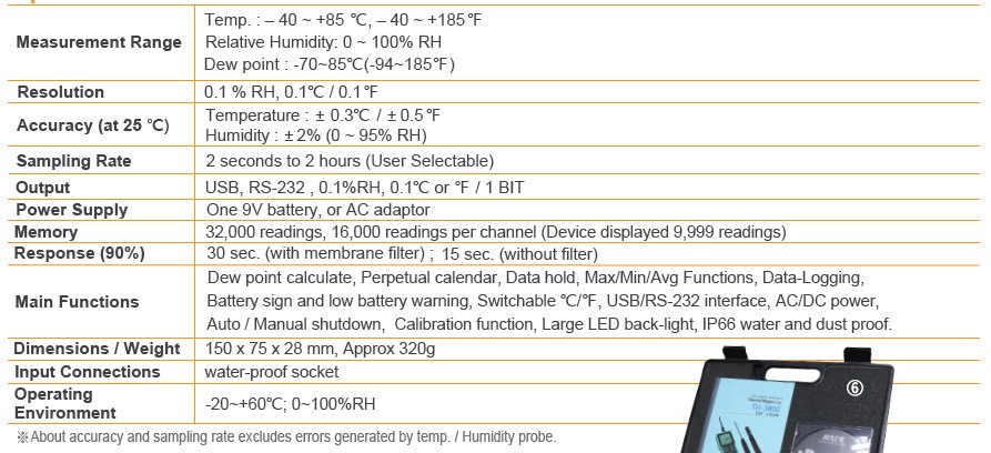 Output USB, RS-232 , 0.1%RH, 0.1℃ or ℉ / 1 BIT
