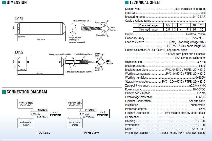 SUBMERSIBLE PRESSURE TRANSMITTER W/ 12M CABLE WITH PTFE SLEAVE