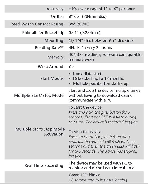 Rainfall Accuracy ±4 % over range of 1 in to 6 in per hour